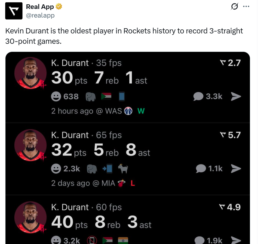 凭借这样的表现,杜兰特已经连续三场轰下30+得分表现,分别是30分、32分和40分,三场合砍102分,让37岁155天的杜兰特成为火箭队史创造这一壮举最老的球员。