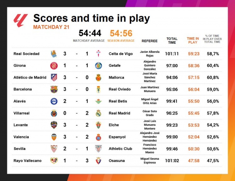 1月27日讯 数据显示,西甲第21轮没有任何一场比赛的净时间超过了60分钟,平均净时间为54分44秒。